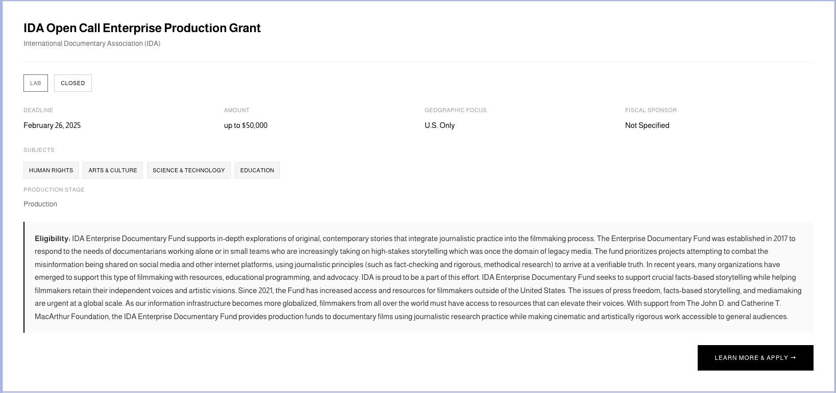 Browsing closed opportunities is useful for identifying funders to track for the next cycle and for planning your production timeline more strategically.