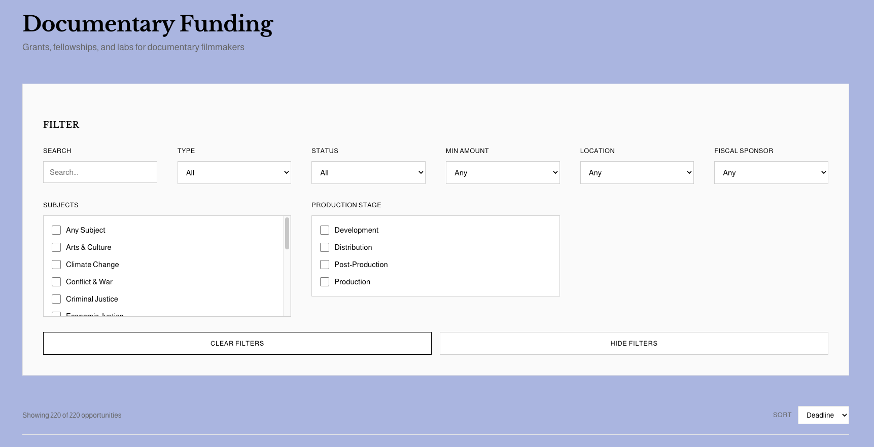 To address that, I built the Documentary Funding Database: a free, searchable tool designed to help filmmakers discover, filter, and track documentary funding opportunities in one place. Currently, the database includes over 200 opportunities and I will be updating this throughout the year.