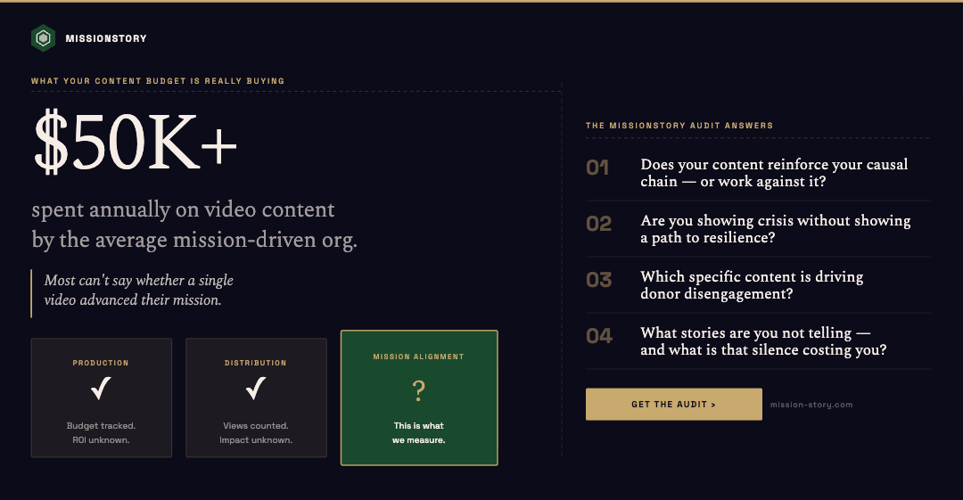 When I audit a nonprofit's content strategy, I'm not looking for production quality. I'm looking for coherence. Do the stories they're telling actually serve the change they're trying to make? Is there a causal logic connecting content strategy to mission outcomes? Or are they optimizing for metrics that feel good but don't move the needle?