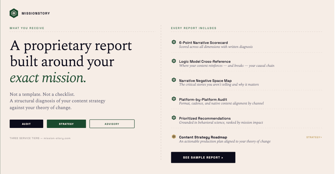 MissionStory offers Impact Gap Analysis audits at three service tiers, from foundational reports to full strategic advisory engagements. Learn more at mission-story.com.