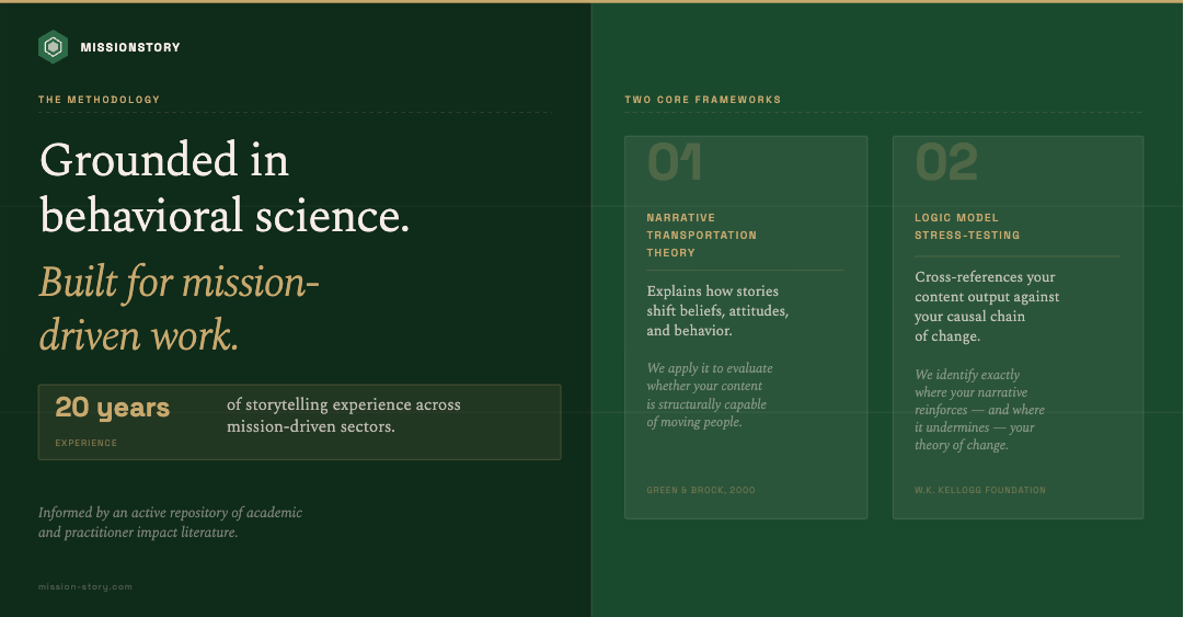 The Impact Gap Analysis draws on two evidence-based frameworks: Narrative Transportation Theory, which explains how stories actually shift beliefs and behaviors, and Logic Model Stress-Testing, which cross-references your actual content output against your causal chain of change.